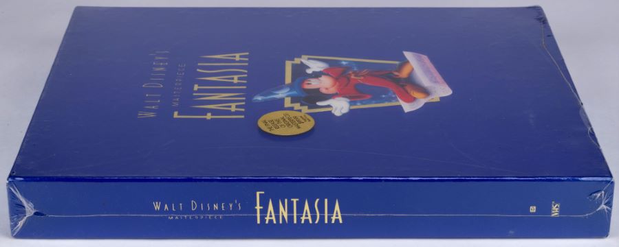 A Masterpiece Collection Deluxe VHS box set for the Disney Studios animated classic "Fantasia" (1940). Released in 1991, the set consists of two VHS tapes, one with the film and the other a "Fantasia Making of the Masterpiece," two CD's with remastered original soundtracks by Leopold Stowkowski, and the Philadelphia Orchestra, a pair of books on the film, and a limited edition commemorative lithograph of a 1939 concept artwork. The set is in fine condition sealed within the 15"x11.5" packaging. The set is still sealed but has some wear to the shrink wrap and corner wear.
