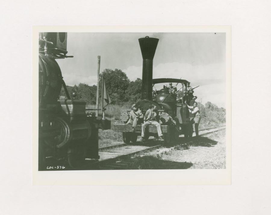 A print of a photograph taken during filming of the 1956 Walt Disney feature “The Great Locomotive Chase.” The reference print was produced in the studio, likely in the 1970s or 1980s, for a marketing or consumer products project. Measuring 8”x10” overall, the photo is in very good condition with minor minor discoloration, including yellowing at the photos edges, and minimal edge wear.